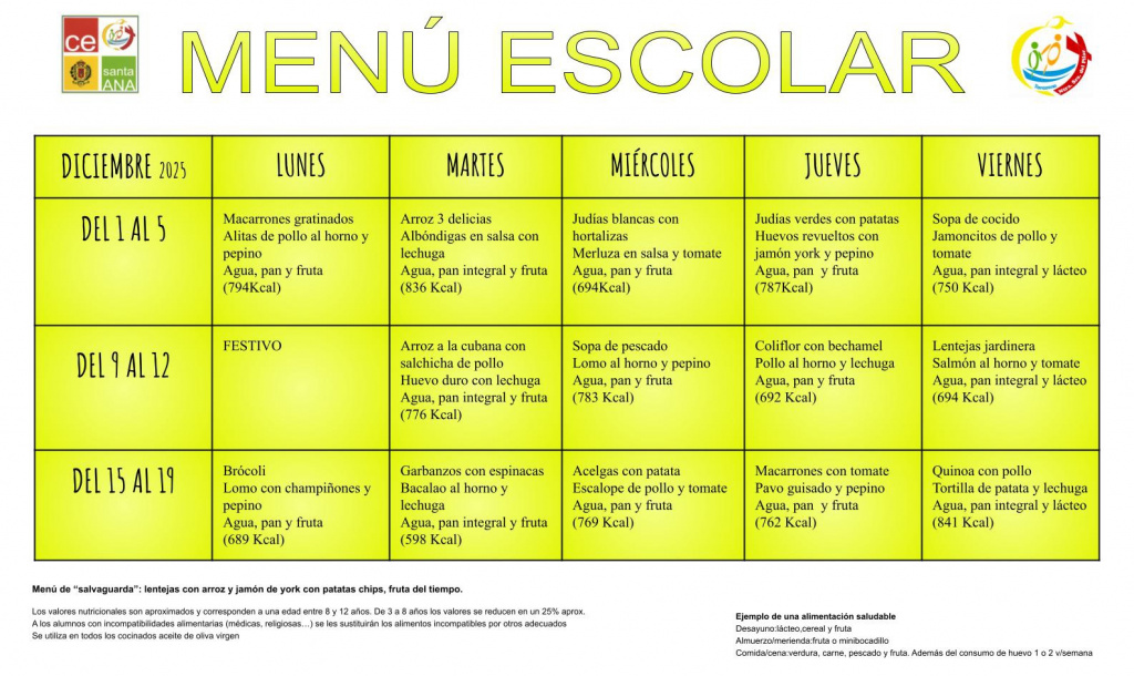 La última semana de cada mes se hace llegar a las familias el menú diseñado para el mes siguiente y se publica en la página web del colegio.